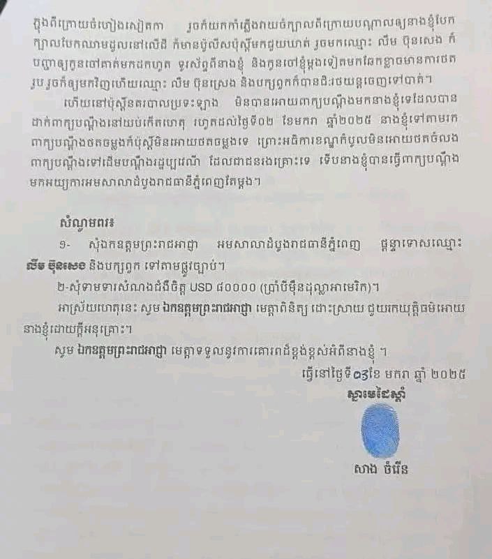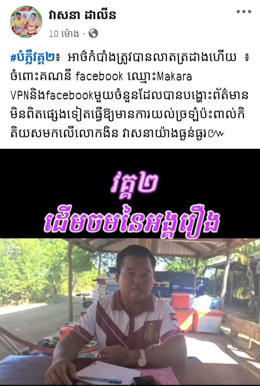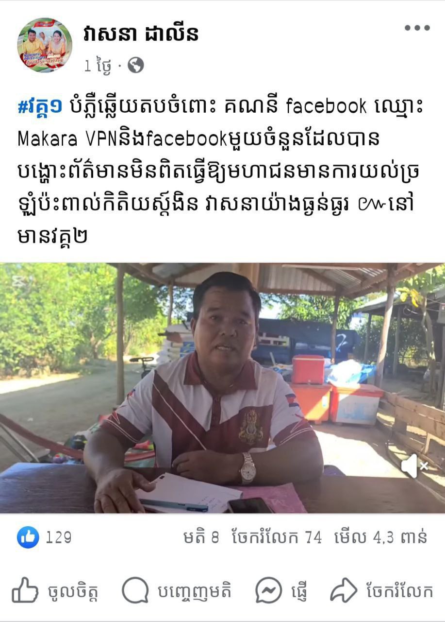 ករណីបង្ហោះចុះផ្សាយព័ត៌មានរបស់Facebookឈ្មោះ Makara vpnខាងលើនេះ ខ្ញុំបាទ សូមធ្វើការបដិសេធច្រានចោលទាំងស្រុង ដោយនៅក្នុងឃ្លីបវិដេអូនិងការសរសេរអត្ថបទគ្មានប្រភពច្បាស់លាស់ ក្នុងចេតនាមួលបង្កាច់មកលើរូបខ្ញុំទាំងស្រុង ចាត់ទុកថា ជាព័ត៌មានគំនុំ ព័ត៌មានក្លែងក្លាយ ដោយមានចេតនាទុច្ចរិតធ្វើឱ្យមហាជនមានការយល់ច្រឡំប៉ះពាល់កិត្តិយសមកលើរូបខ្ញុំយ៉ាងធ្ងន់ធ្ងរ ការចុះផ្សាយរបស់Facebook ឈ្មោះMakara vpnខាងលើនេះគឺជាឈ្នាន់ បំរើឲ្យបុគ្គលមិនល្អ ដោយមួយរយ:កន្លងមកនេះខ្ញុំបាទមានការវល់កិច្ចការផ្ទះនិងមានជម្ងឺប្រចាំកាយមិនបានដើរចាកចេញពីផ្ទះទៅណាឆ្ងាយម្ដងណាឡើយម្យ៉ាងទៀតខ្ញុំបាទមិនដែលស្គាល់ជនជាតិវៀតណាមម្នាក់នោះទាល់តែសោះ ។