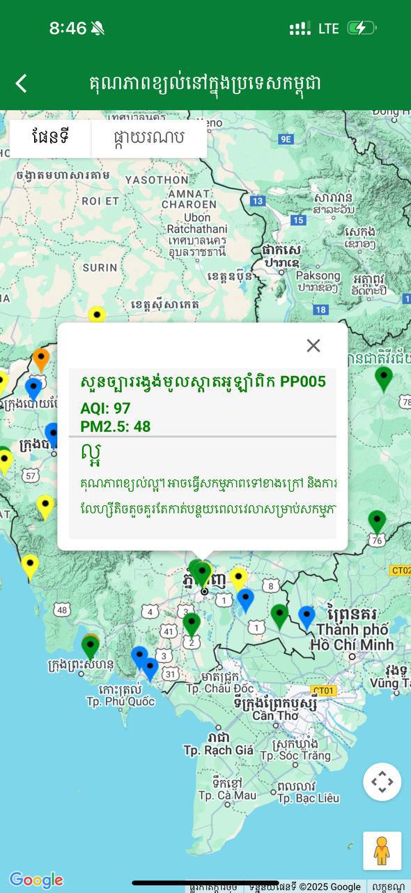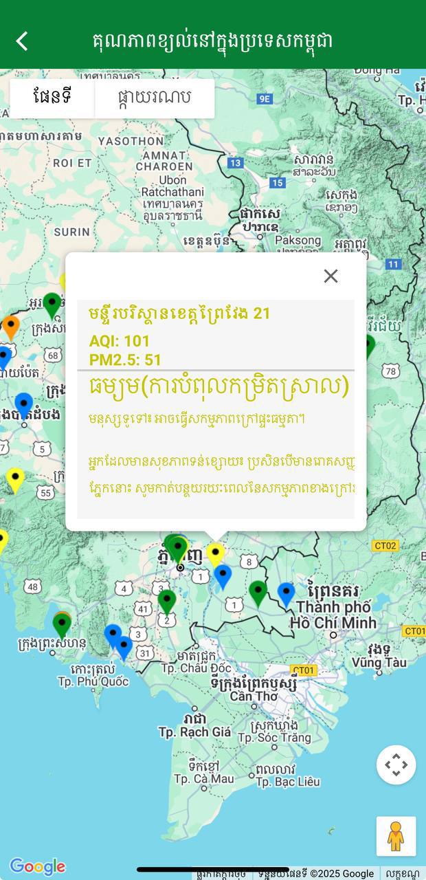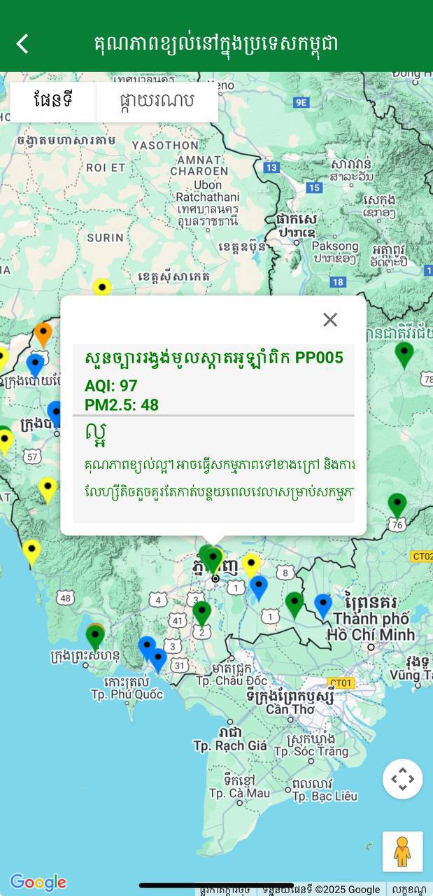 សូមបញ្ជាក់ថា ស្ថានភាពគុណភាពខ្យល់នៅក្នុងព្រះរាជាណាចក្រកម្ពុជា ចាប់ពីម៉ោង ៧ ព្រឹក ថ្ងៃទី២៥ ខែមីនា ឆ្នាំ២០២៥ ដល់ម៉ោង ៧ ព្រឹក ថ្ងៃទី២៦ ខែមីនា ឆ្នាំ២០២៥ មានកំហាប់ភាគល្អិតនិចលគិតជាមធ្យមស្មើនឹង៤៧.២៣ µg/m3 ធៀបនឹងស្តង់ដារ ៥០ ug/m3 និងគិតជាសន្ទស្សន៍គុណភាពខ្យល់ (Air Quality Index) គឺ “ល្អ”។ ក្នុងការតាមដាននេះ ខេត្តដែលមានសន្ទស្សន៍គុណភាពខ្យល់ ពណ៌ខៀវៈ គុណភាពខ្យល់ល្អណាស់ គឺ ខេត្តកំពង់ឆ្នាំង ខេត្តកំពត ខេត្តក្រចេះ ខេត្តកែប និងខេត្តត្បូងឃ្មុំ។ ចំពោះពណ៌បៃតងៈ គុណភាពខ្យល់ល្អមាន មានខេត្តកំពង់ចាម ខេត្តកំពង់ធំ ខេត្តបាត់ដំបង ខេត្តកំពង់ស្ពឺ ខេត្តមណ្ឌលគីរី ខេត្តព្រៃវែង ខេត្តស្វាយរៀង ខេត្តព្រះសីហនុ ខេត្តឧត្តរមានជ័យ ខេត្តពោធិ័សាត់ ខេត្តស្ទឹងត្រែង ខេត្តប៉ៃលិន ខេត្តតាកែវ។ ដោយឡែកក្នុងសន្ទស្សន៍ពណ៌លឿងៈ មានខេត្តបន្ទាយមានជ័យ ខេត្តកណ្តាល ខេត្តកោះកុង រាជធានីភ្នំពេញ ខេត្តព្រះវិហារ ខេត្តរតនគិរី និងខេត្តសៀមរាប៕